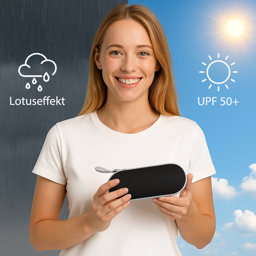 Die winddichten Schirmrippen sorgen dafür, dass Brelli auch bei stärkerem Wind zuverlässig hält. Dank der speziellen, vierlagigen Beschichtung blockiert er effektiv schädliche UV-Strahlen (UPF 50+) und reduziert die Hitze unter dem Schirm – ideal für sonnige Tage. Das wasserabweisende Material lässt Regentropfen einfach abperlen, sodass dein Brelli im Handumdrehen wieder trocken ist.